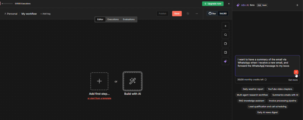 n8n 最新嘅 AI 功能令你唔洗知每個 node 點用,淨係講你想要乜就得。撳介面中間個 “Build with AI” 按鈕,喺右邊個 prompt 欄打:「當我收到新 Email ,就幫我摘要內容重點,然後發去我嘅 WhatsApp」,然後㩒制。